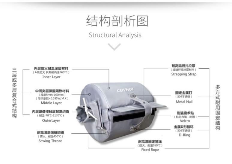 中間層為保溫棉填充層,起保溫隔熱的作用。根據(jù)不同的使用場(chǎng)景,一般選擇導(dǎo)熱系數(shù)低,憎水性好的保溫材料。在特定情況下,我們也會(huì)使用多種填充材料相結(jié)合的方案來(lái)確保我們的保溫套(衣)符合設(shè)備的需求。