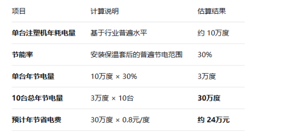 基礎(chǔ)數(shù)據(jù):一臺中型注塑機(假設(shè)功率為15kW)的年耗電量巨大。其加熱圈部分(即保溫套主要節(jié)能對象)的耗能約占整機能耗的30%-40%。